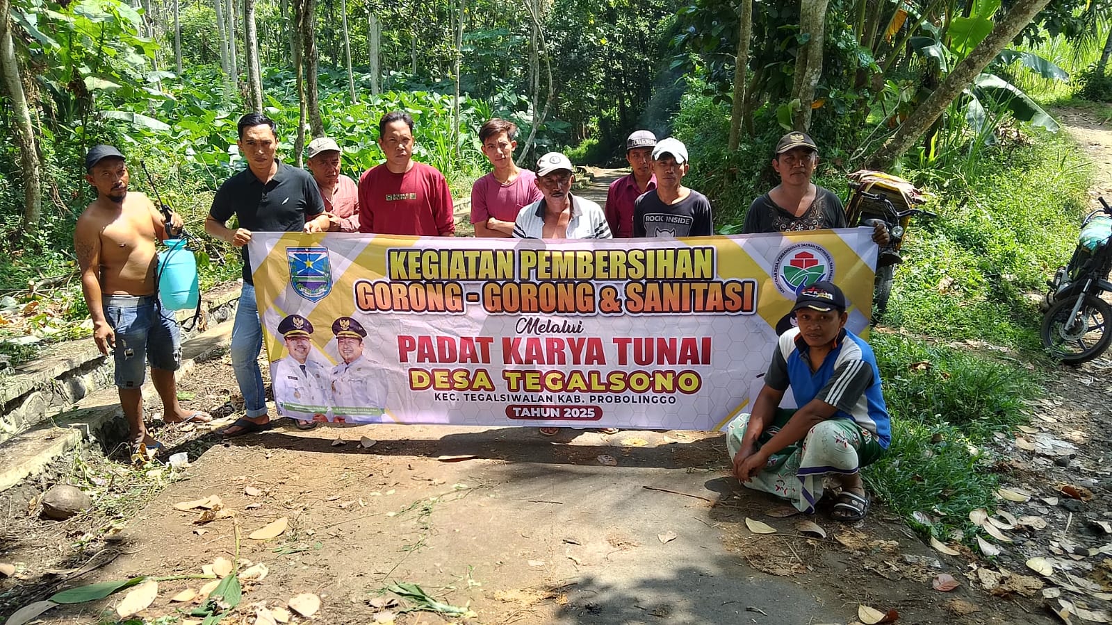 Tegalsono — Puluhan warga Desa Tegalsono, Kecamatan Tegalsiwalan, Kabupaten Probolinggo, kompak melaksanakan kegiatan Padat Karya Pembersihan Gorong-Gorong dan Sanitasi, Senin (28/4/2025). Kegiatan dipusatkan di Dusun Tanian Panjang dan Dusun Bandungan dengan melibatkan pemerintah desa, Koramil, dan masyarakat.